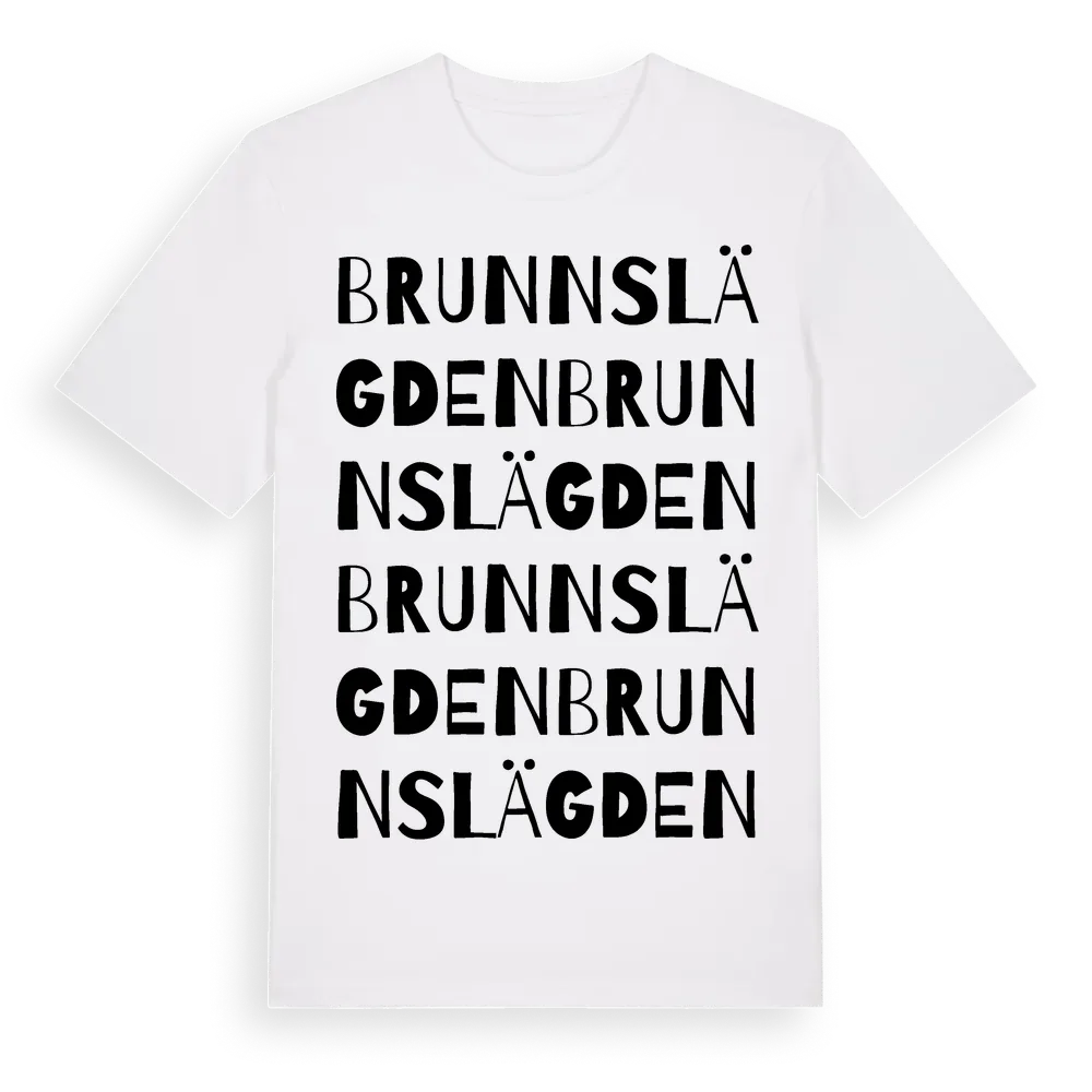 Brunnslägden ordlek t-shirt är inspirerad av Brunnslägden i Jämtlands län, Sverige. Tröjan är designad för dig som har en speciell koppling till platsen – oavsett om du bor här, har rötterna här eller bara älskar Brunnslägden.