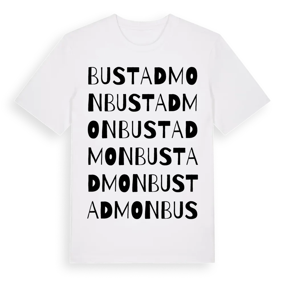 Bustadmon ordlek t-shirt är inspirerad av byn Bustadmon i Jämtlands län, Sverige. Tröjan är designad för dig som har en speciell koppling till platsen – oavsett om du bor här, har rötterna här eller bara älskar Bustadmon.