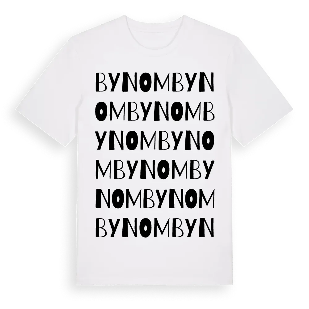 Bynom ordlek t-shirt är inspirerad av byn Bynom i Jämtlands län, Sverige. Tröjan är designad för dig som har en speciell koppling till platsen – oavsett om du bor här, har rötterna här eller bara älskar Bynom.