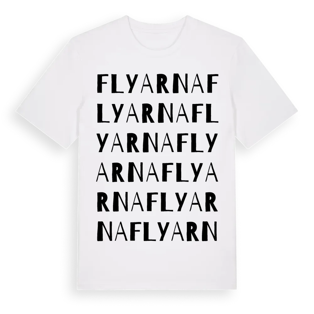 En ordlek byggd på Flyarnas namn. Subtilt och klurig – ett motiv som bara de som verkligen känner platsen fullt ut förstår. Premium bomull, unisex – från Flyarna i Jämtlands län.