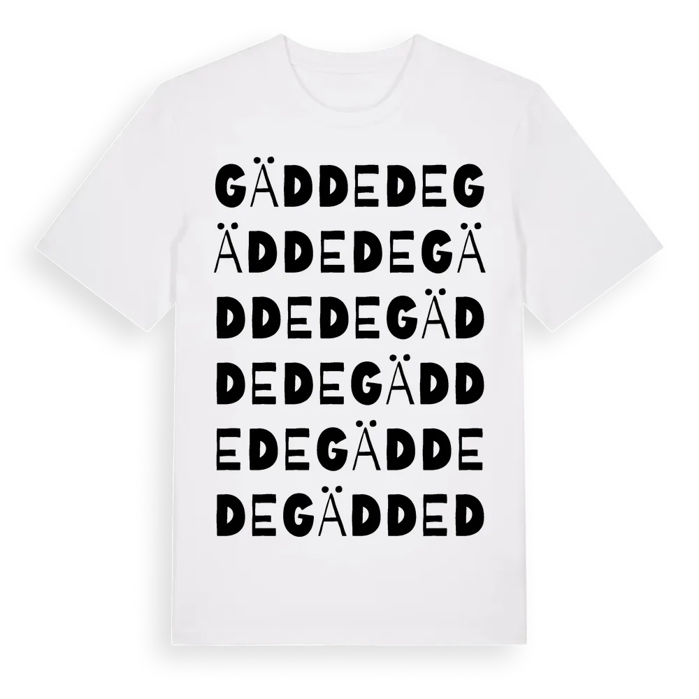 Gäddede ordlek t-shirt är inspirerad av byn Gäddede i Jämtlands län, Sverige. Tröjan är designad för dig som har en speciell koppling till platsen – oavsett om du bor här, har rötterna här eller bara älskar Gäddede.
