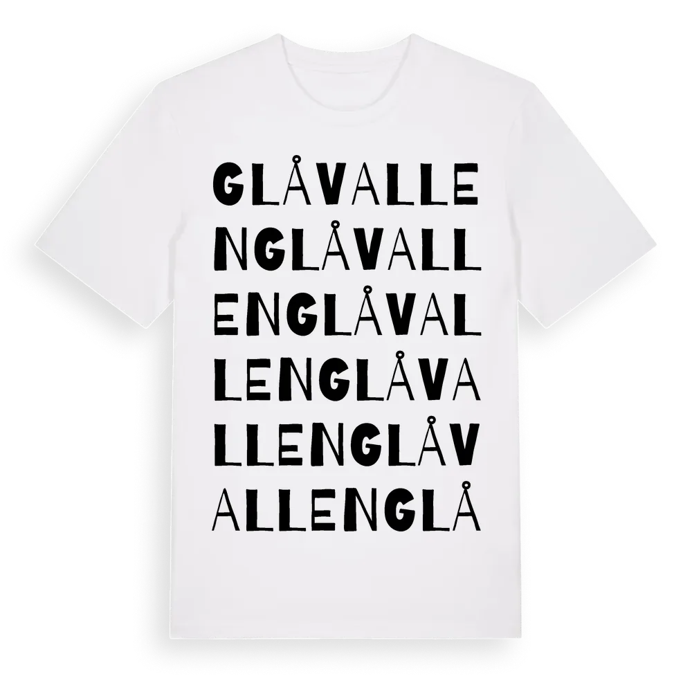 Glåvallen ordlek t-shirt är inspirerad av Glåvallen i Jämtlands län, Sverige. Tröjan är designad för dig som har en speciell koppling till platsen – oavsett om du bor här, har rötterna här eller bara älskar Glåvallen.