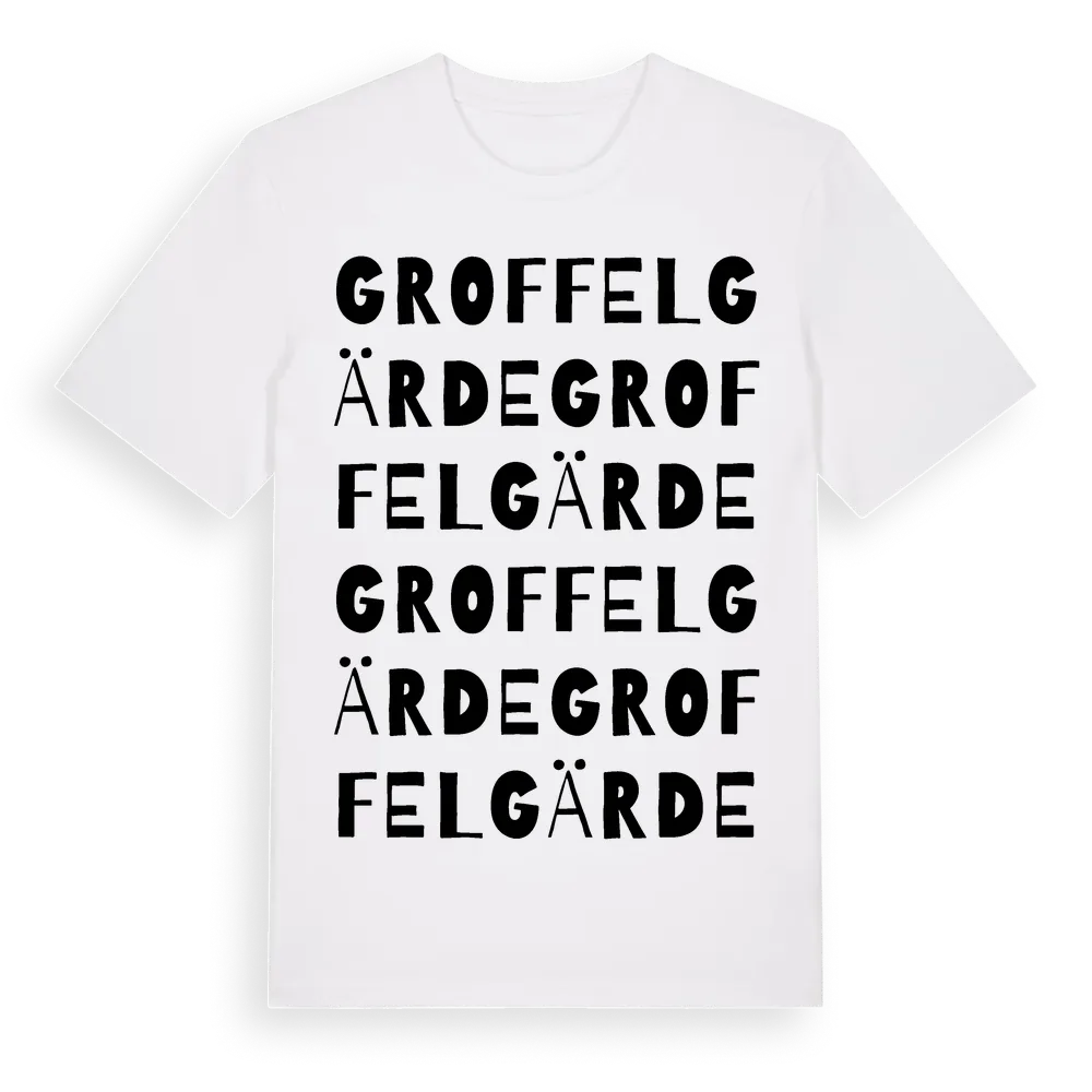 Groffelgärde ordlek t-shirt är inspirerad av Groffelgärde i Jämtlands län, Sverige. Tröjan är designad för dig som har en speciell koppling till platsen – oavsett om du bor här, har rötterna här eller bara älskar Groffelgärde.