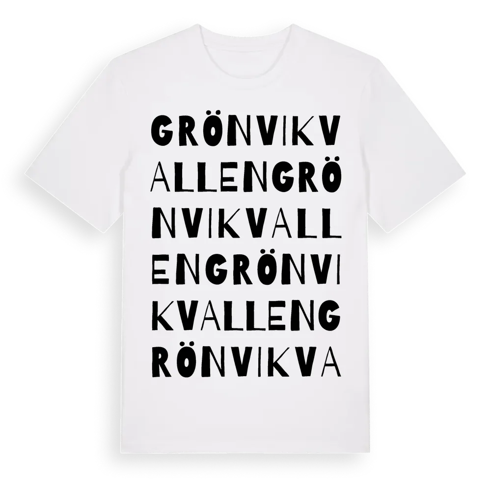 Grönvikvallen ordlek t-shirt är inspirerad av Grönvikvallen i Jämtlands län, Sverige. Tröjan är designad för dig som har en speciell koppling till platsen – oavsett om du bor här, har rötterna här eller bara älskar Grönvikvallen.