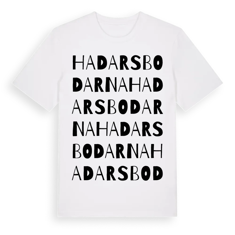 Hadarsbodarna ordlek t-shirt är inspirerad av Hadarsbodarna i Jämtlands län, Sverige. Tröjan är designad för dig som har en speciell koppling till platsen – oavsett om du bor här, har rötterna här eller bara älskar Hadarsbodarna.