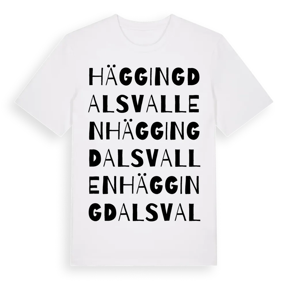 Häggingdalsvallen ordlek t-shirt är inspirerad av Häggingdalsvallen i Jämtlands län, Sverige. Tröjan är designad för dig som har en speciell koppling till platsen – oavsett om du bor här, har rötterna här eller bara älskar Häggingdalsvallen.