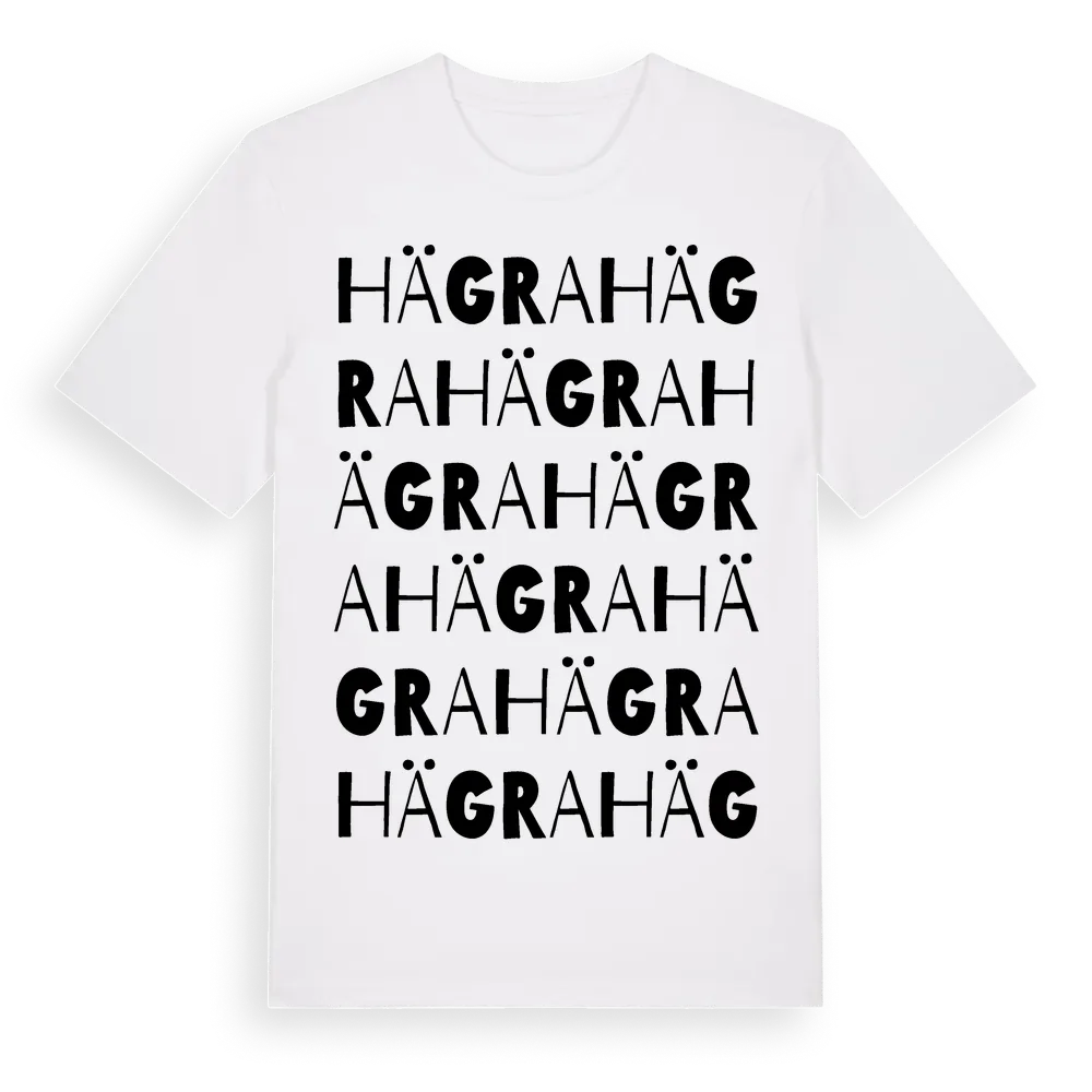 Hägra ordlek t-shirt är inspirerad av byn Hägra i Jämtlands län, Sverige. Tröjan är designad för dig som har en speciell koppling till platsen – oavsett om du bor här, har rötterna här eller bara älskar Hägra.