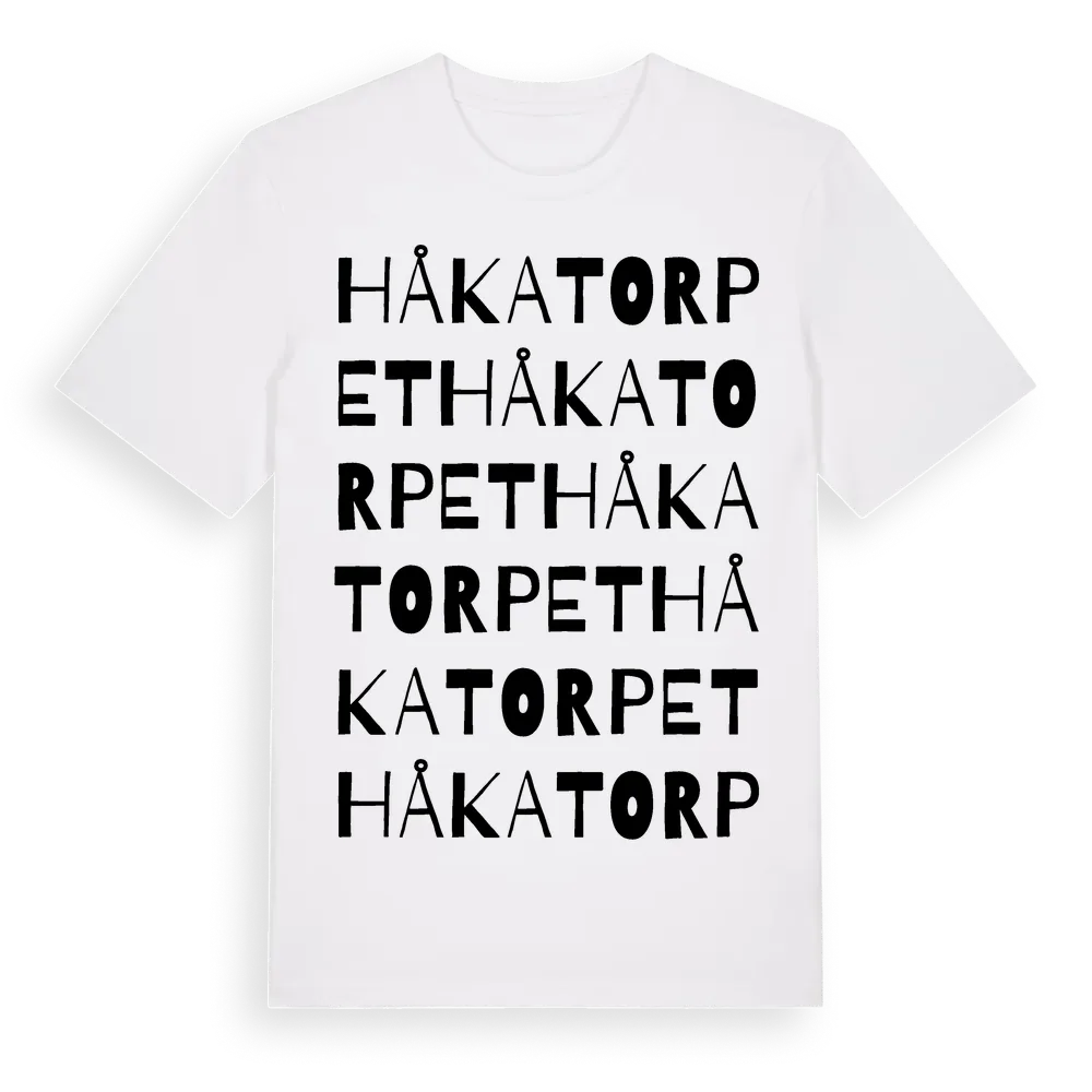 Håkatorpet ordlek t-shirt är inspirerad av Håkatorpet i Jämtlands län, Sverige. Tröjan är designad för dig som har en speciell koppling till platsen – oavsett om du bor här, har rötterna här eller bara älskar Håkatorpet.