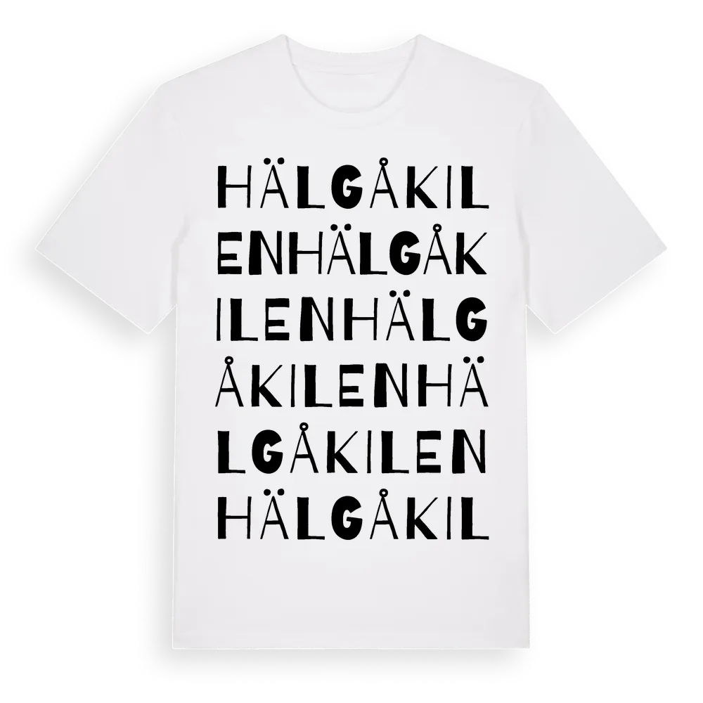Hälgåkilen ordlek t-shirt är inspirerad av byn Hälgåkilen i Jämtlands län, Sverige. Tröjan är designad för dig som har en speciell koppling till platsen – oavsett om du bor här, har rötterna här eller bara älskar Hälgåkilen.