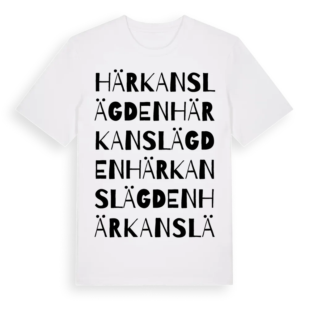 Härkanslägden ordlek t-shirt är inspirerad av byn Härkanslägden i Jämtlands län, Sverige. Tröjan är designad för dig som har en speciell koppling till platsen – oavsett om du bor här, har rötterna här eller bara älskar Härkanslägden.