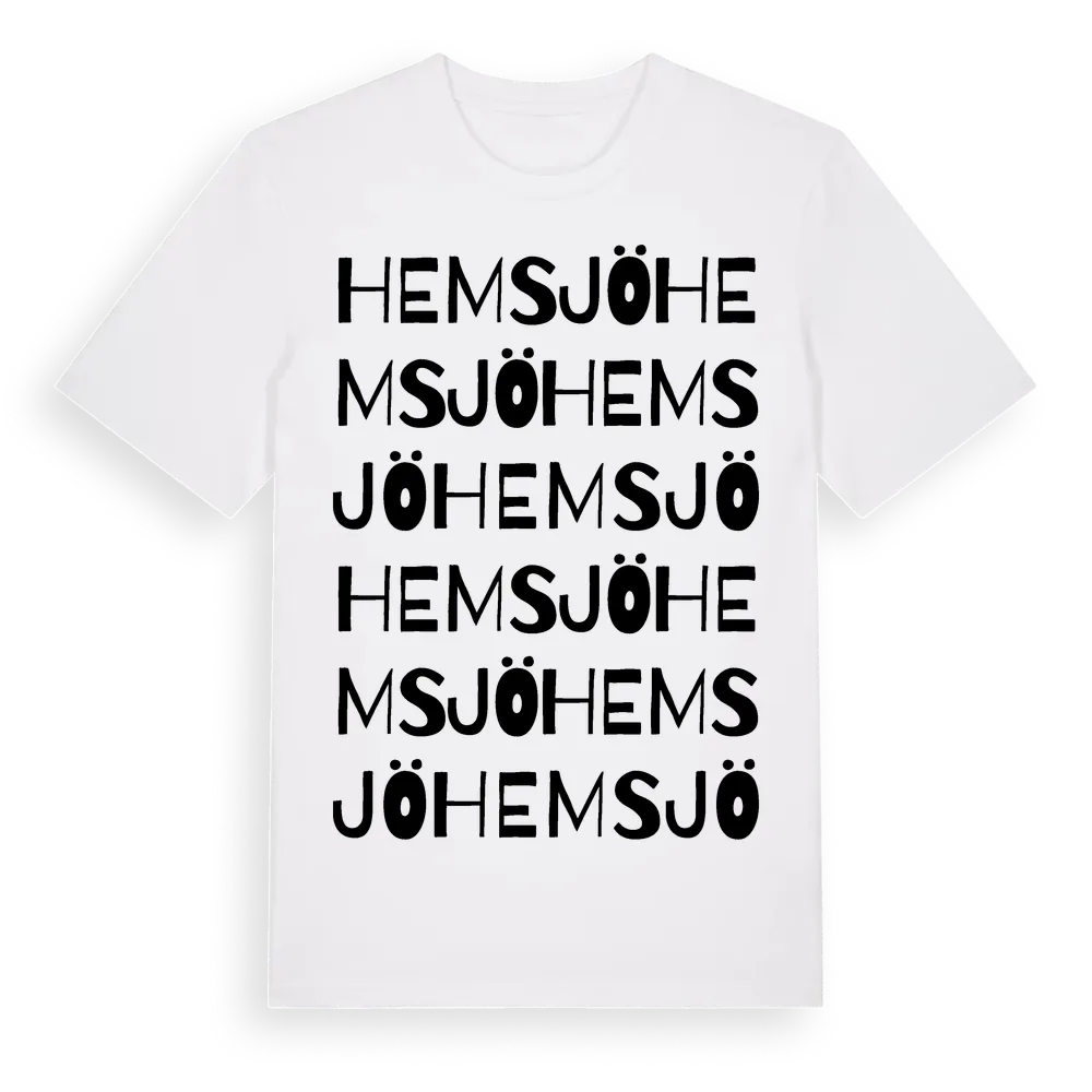 Hemsjö ordlek t-shirt är inspirerad av byn Hemsjö i Jämtlands län, Sverige. Tröjan är designad för dig som har en speciell koppling till platsen – oavsett om du bor här, har rötterna här eller bara älskar Hemsjö.