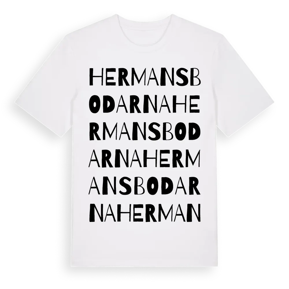 Hermansbodarna ordlek t-shirt är inspirerad av Hermansbodarna i Jämtlands län, Sverige. Tröjan är designad för dig som har en speciell koppling till platsen – oavsett om du bor här, har rötterna här eller bara älskar Hermansbodarna.