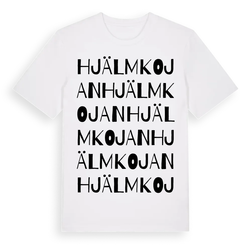 Hjälmkojan ordlek t-shirt är inspirerad av Hjälmkojan i Jämtlands län, Sverige. Tröjan är designad för dig som har en speciell koppling till platsen – oavsett om du bor här, har rötterna här eller bara älskar Hjälmkojan.