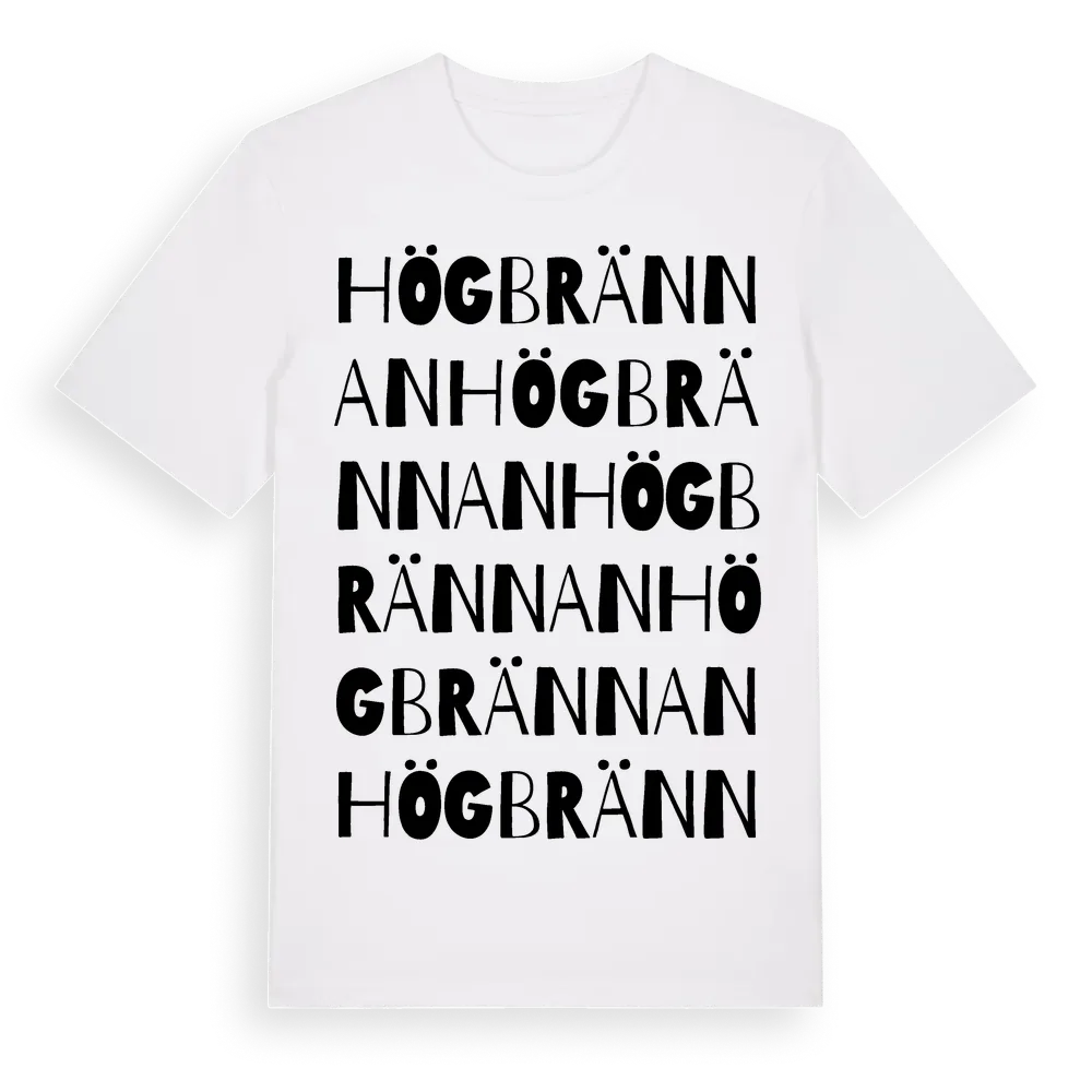 Högbrännan ordlek t-shirt är inspirerad av Högbrännan i Jämtlands län, Sverige. Tröjan är designad för dig som har en speciell koppling till platsen – oavsett om du bor här, har rötterna här eller bara älskar Högbrännan.