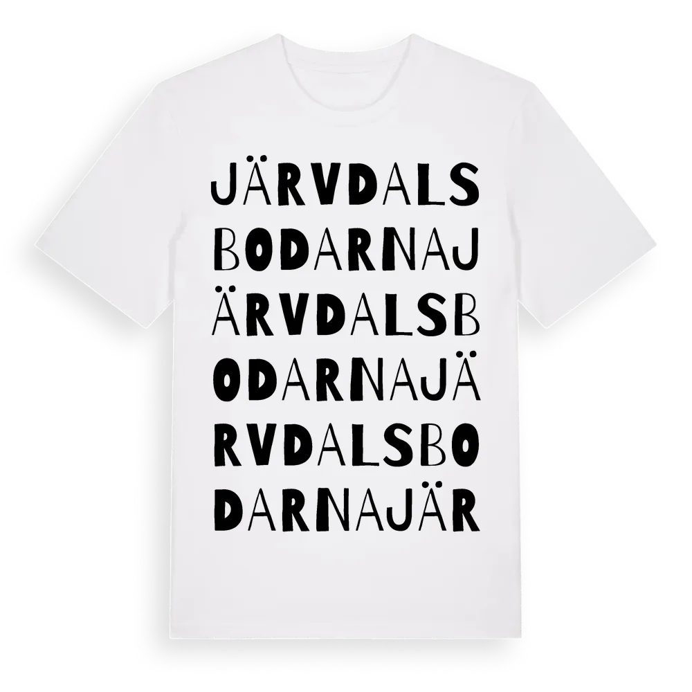 Järvdalsbodarna ordlek t-shirt är inspirerad av Järvdalsbodarna i Jämtlands län, Sverige. Tröjan är designad för dig som har en speciell koppling till platsen – oavsett om du bor här, har rötterna här eller bara älskar Järvdalsbodarna.
