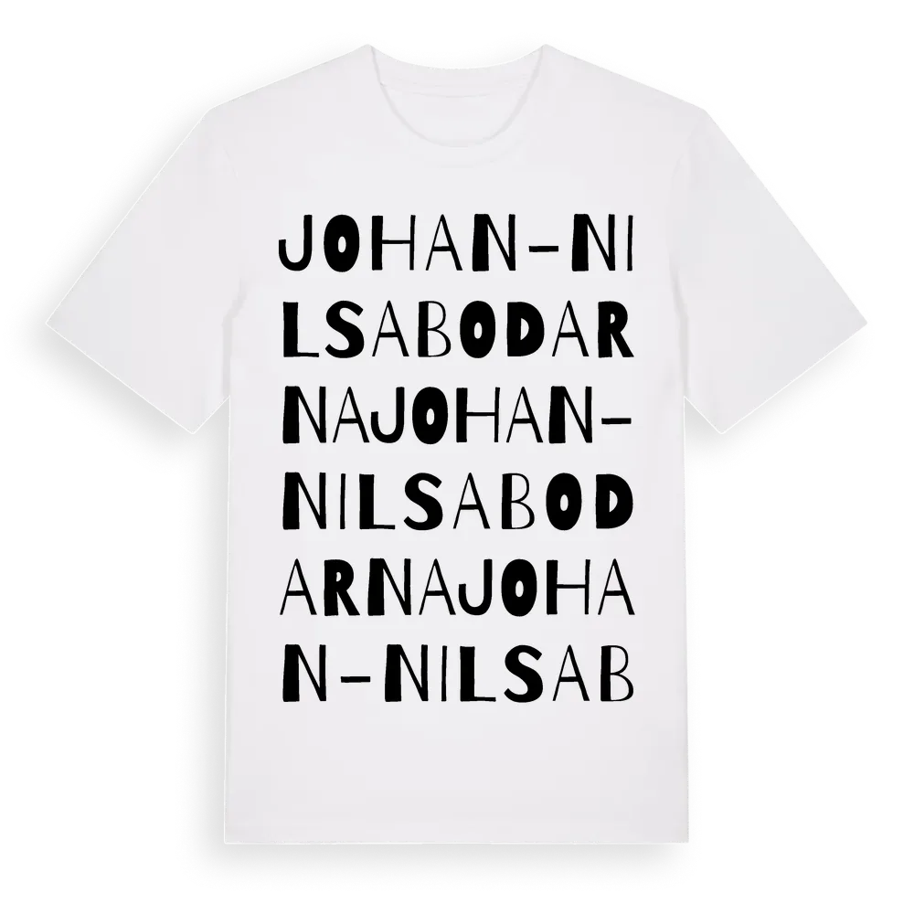 Johan-Nilsabodarna ordlek t-shirt är inspirerad av Johan-Nilsabodarna i Jämtlands län, Sverige. Tröjan är designad för dig som har en speciell koppling till platsen – oavsett om du bor här, har rötterna här eller bara älskar Johan-Nilsabodarna.