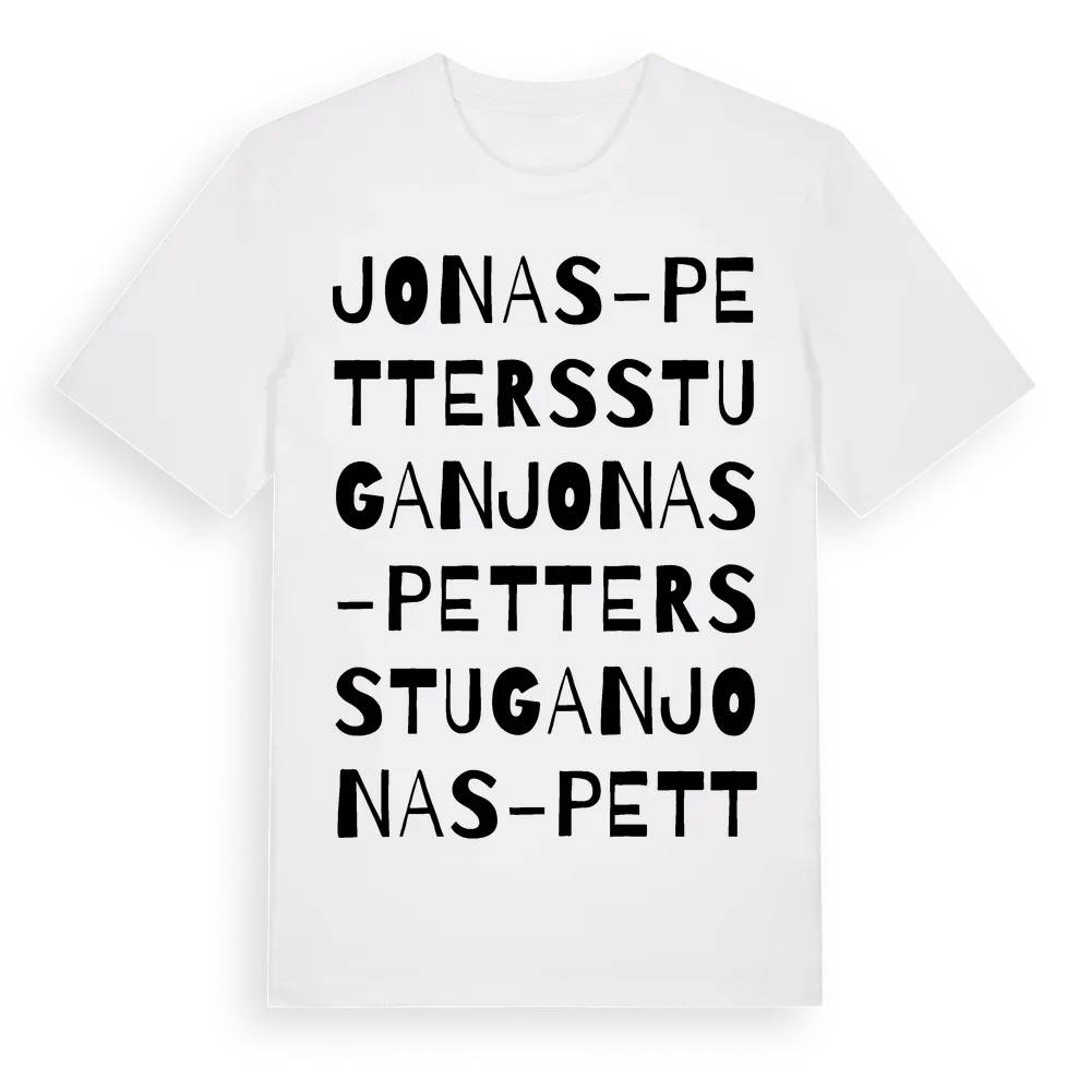 Jonas-Pettersstugan ordlek t-shirt är inspirerad av Jonas-Pettersstugan i Jämtlands län, Sverige. Tröjan är designad för dig som har en speciell koppling till platsen – oavsett om du bor här, har rötterna här eller bara älskar Jonas-Pettersstugan.