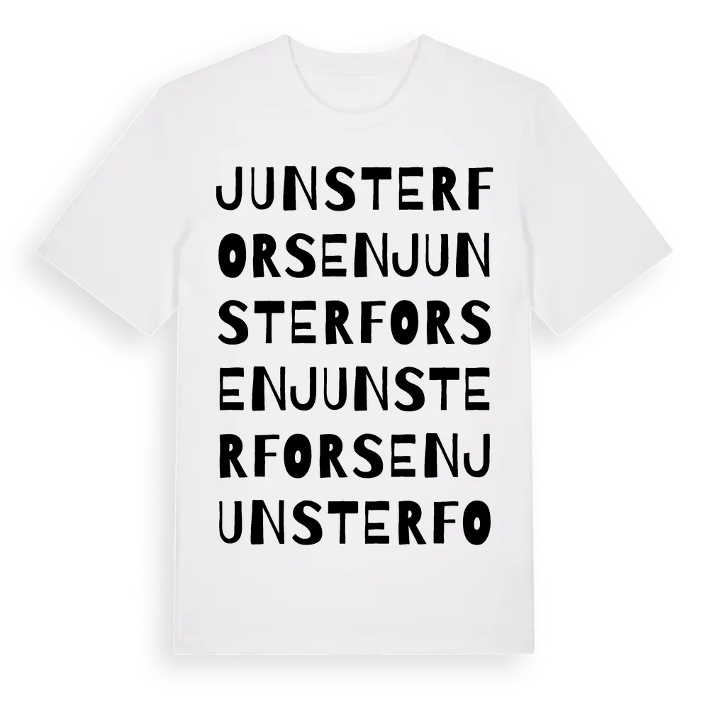 Junsterforsen ordlek t-shirt är inspirerad av byn Junsterforsen i Jämtlands län, Sverige. Tröjan är designad för dig som har en speciell koppling till platsen – oavsett om du bor här, har rötterna här eller bara älskar Junsterforsen.