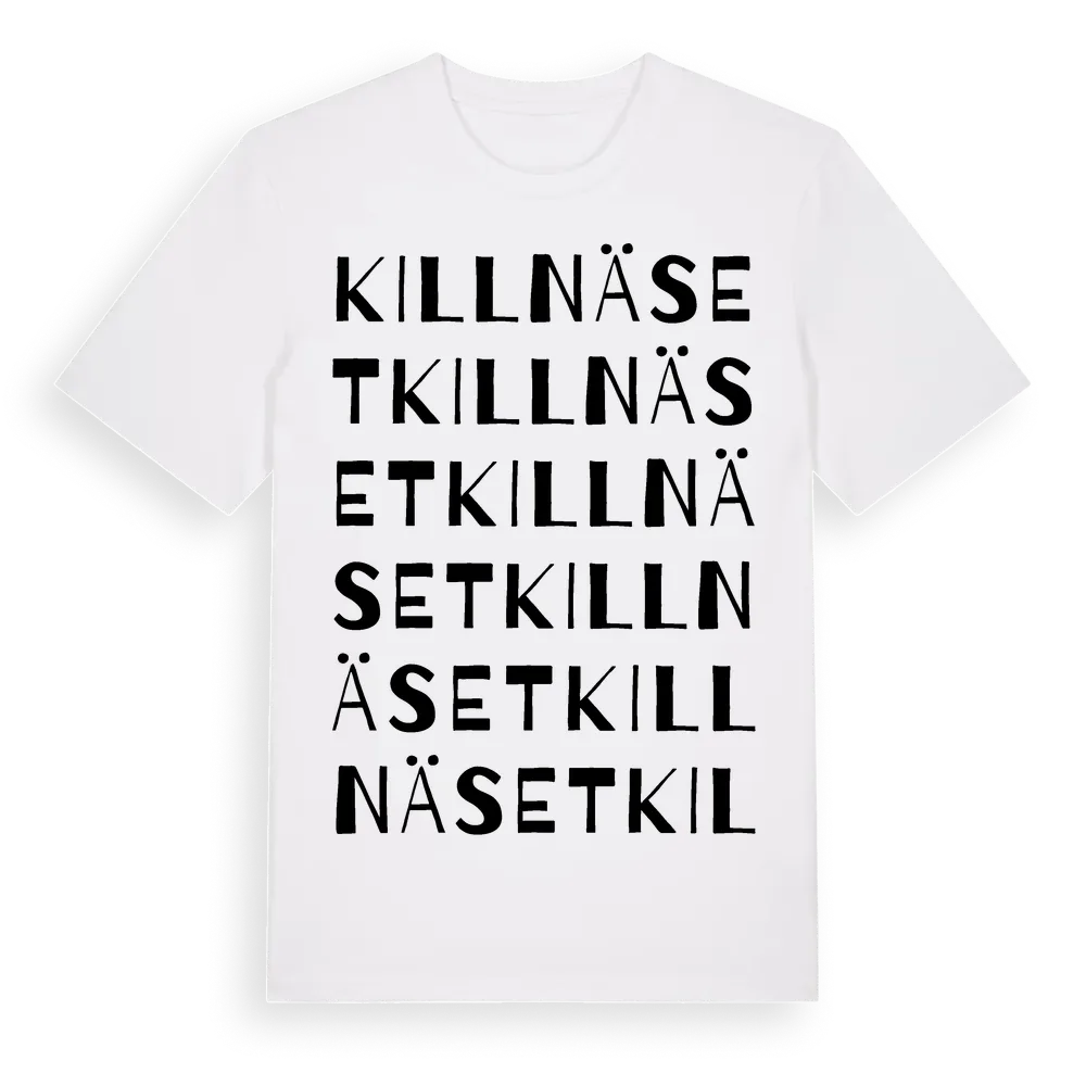 Killnäset ordlek t-shirt är inspirerad av byn Killnäset i Jämtlands län, Sverige. Tröjan är designad för dig som har en speciell koppling till platsen – oavsett om du bor här, har rötterna här eller bara älskar Killnäset.