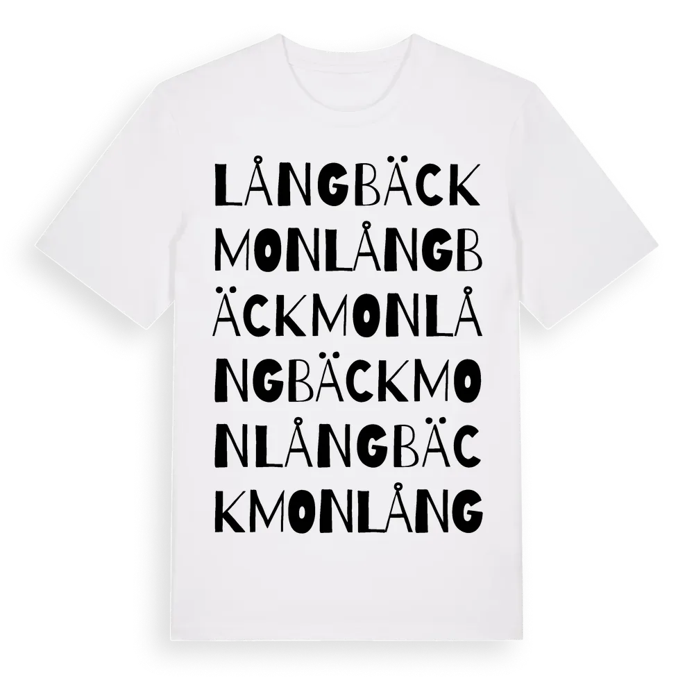 Långbäckmon ordlek t-shirt är inspirerad av Långbäckmon i Jämtlands län, Sverige. Tröjan är designad för dig som har en speciell koppling till platsen – oavsett om du bor här, har rötterna här eller bara älskar Långbäckmon.