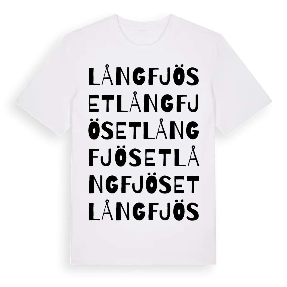 Långfjöset ordlek t-shirt är inspirerad av Långfjöset i Jämtlands län, Sverige. Tröjan är designad för dig som har en speciell koppling till platsen – oavsett om du bor här, har rötterna här eller bara älskar Långfjöset.
