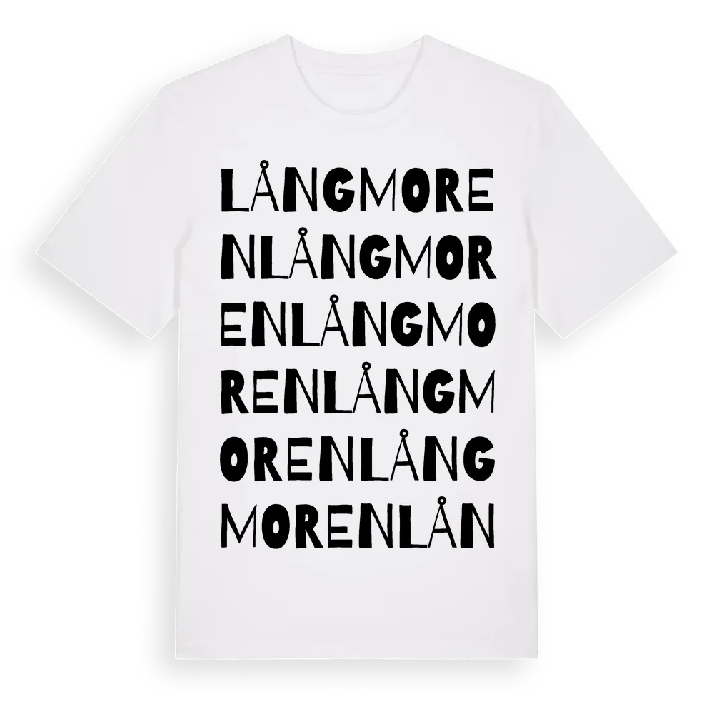 Långmoren ordlek t-shirt är inspirerad av Långmoren i Jämtlands län, Sverige. Tröjan är designad för dig som har en speciell koppling till platsen – oavsett om du bor här, har rötterna här eller bara älskar Långmoren.