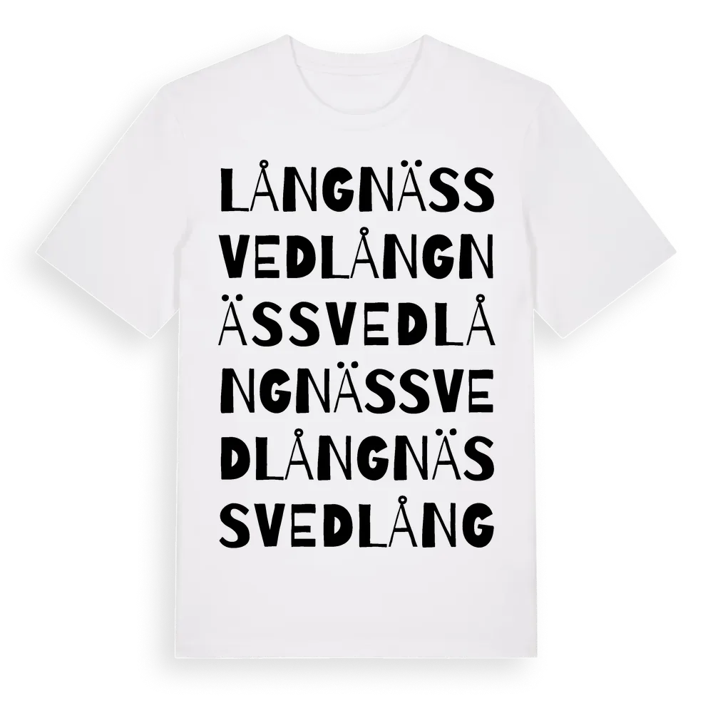 Långnässved ordlek t-shirt är inspirerad av byn Långnässved i Jämtlands län, Sverige. Tröjan är designad för dig som har en speciell koppling till platsen – oavsett om du bor här, har rötterna här eller bara älskar Långnässved.