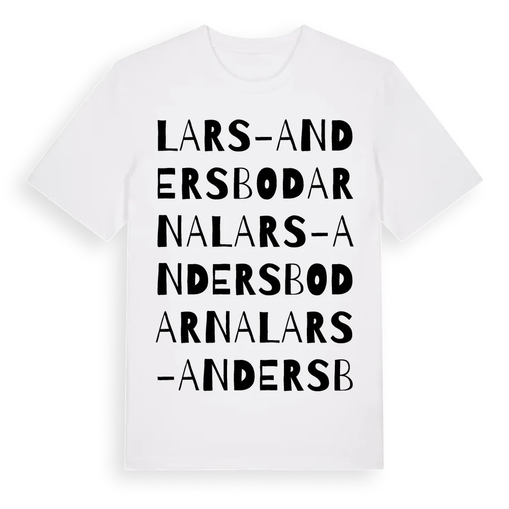 Lars-Andersbodarna ordlek t-shirt är inspirerad av Lars-Andersbodarna i Jämtlands län, Sverige. Tröjan är designad för dig som har en speciell koppling till platsen – oavsett om du bor här, har rötterna här eller bara älskar Lars-Andersbodarna.