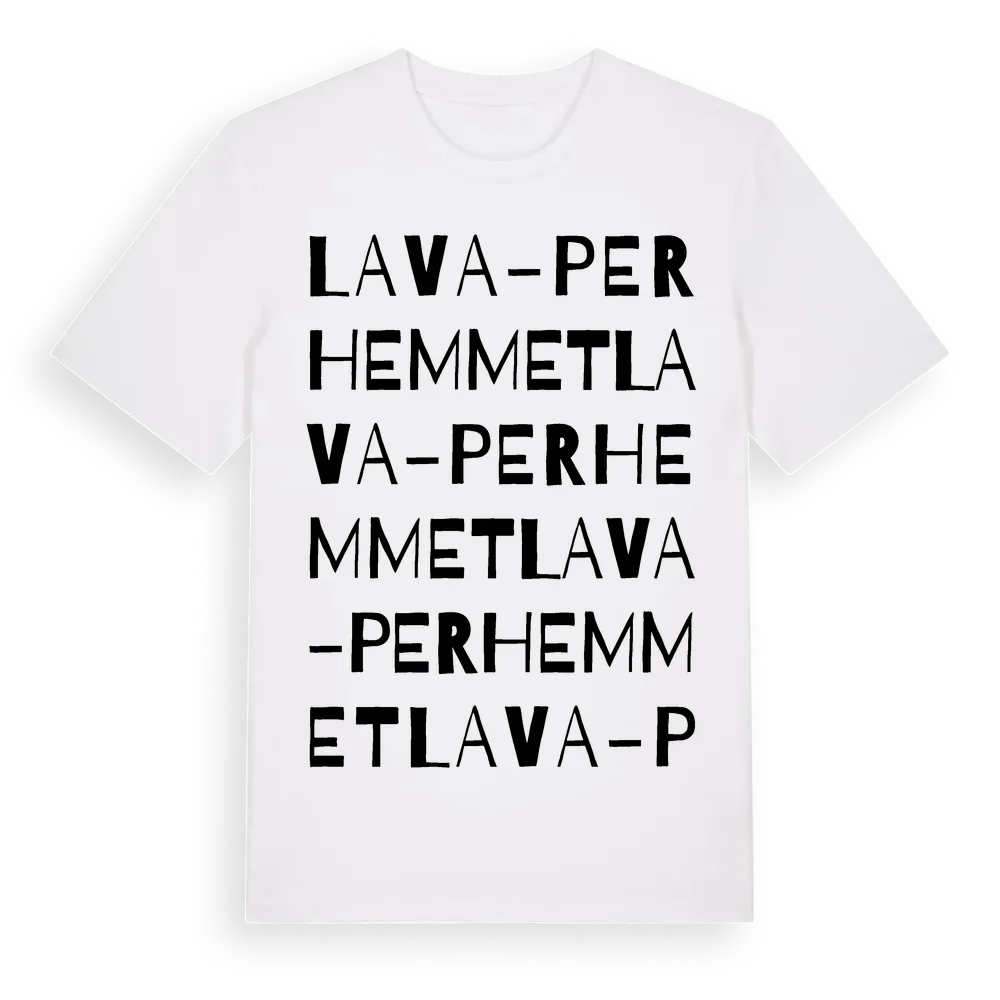 Lava-Perhemmet ordlek t-shirt är inspirerad av Lava-Perhemmet i Jämtlands län, Sverige. Tröjan är designad för dig som har en speciell koppling till platsen – oavsett om du bor här, har rötterna här eller bara älskar Lava-Perhemmet.