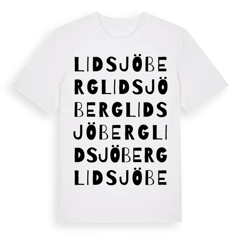 Lidsjöberg ordlek t-shirt är inspirerad av byn Lidsjöberg i Jämtlands län, Sverige. Tröjan är designad för dig som har en speciell koppling till platsen – oavsett om du bor här, har rötterna här eller bara älskar Lidsjöberg.