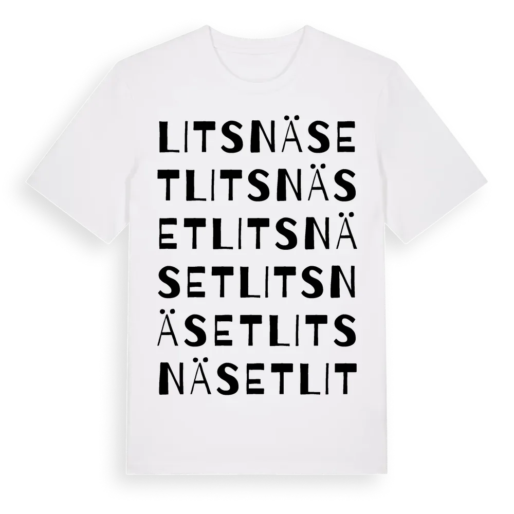 Litsnäset ordlek t-shirt är inspirerad av byn Litsnäset i Jämtlands län, Sverige. Tröjan är designad för dig som har en speciell koppling till platsen – oavsett om du bor här, har rötterna här eller bara älskar Litsnäset.
