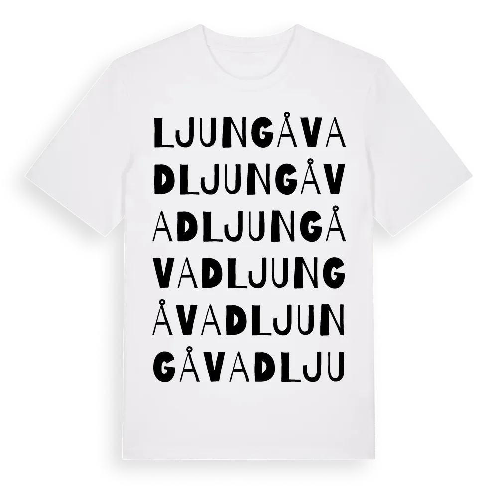 Ljungå Vad ordlek t-shirt är inspirerad av Ljungå Vad i Jämtlands län, Sverige. Tröjan är designad för dig som har en speciell koppling till platsen – oavsett om du bor här, har rötterna här eller bara älskar Ljungå Vad.