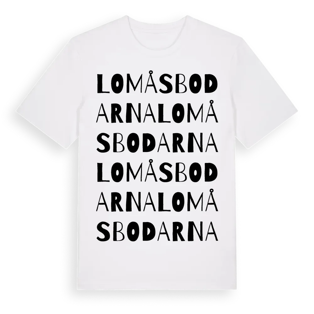 Lomåsbodarna ordlek t-shirt är inspirerad av Lomåsbodarna i Jämtlands län, Sverige. Tröjan är designad för dig som har en speciell koppling till platsen – oavsett om du bor här, har rötterna här eller bara älskar Lomåsbodarna.