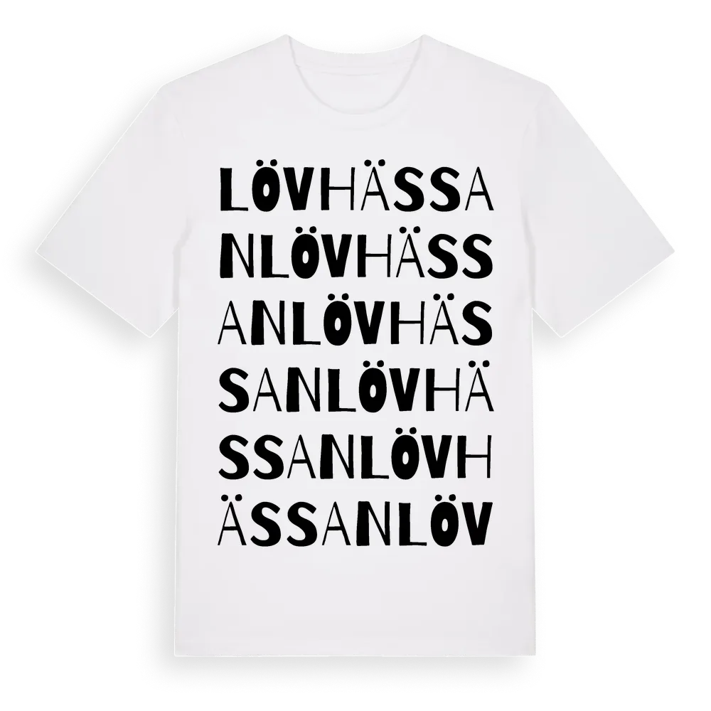 Lövhässan ordlek t-shirt är inspirerad av Lövhässan i Jämtlands län, Sverige. Tröjan är designad för dig som har en speciell koppling till platsen – oavsett om du bor här, har rötterna här eller bara älskar Lövhässan.