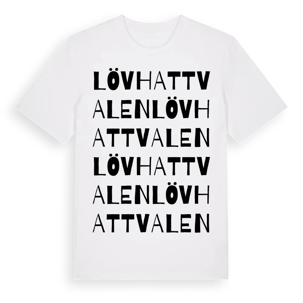 Lövhattvalen ordlek t-shirt är inspirerad av Lövhattvalen i Jämtlands län, Sverige. Tröjan är designad för dig som har en speciell koppling till platsen – oavsett om du bor här, har rötterna här eller bara älskar Lövhattvalen.