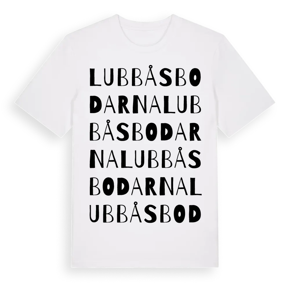 Lubbåsbodarna ordlek t-shirt är inspirerad av Lubbåsbodarna i Jämtlands län, Sverige. Tröjan är designad för dig som har en speciell koppling till platsen – oavsett om du bor här, har rötterna här eller bara älskar Lubbåsbodarna.