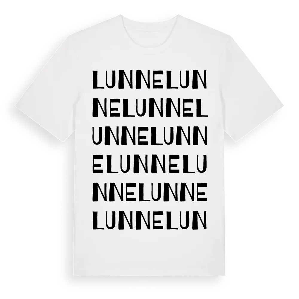 Lunne ordlek t-shirt är inspirerad av byn Lunne i Jämtlands län, Sverige. Tröjan är designad för dig som har en speciell koppling till platsen – oavsett om du bor här, har rötterna här eller bara älskar Lunne.