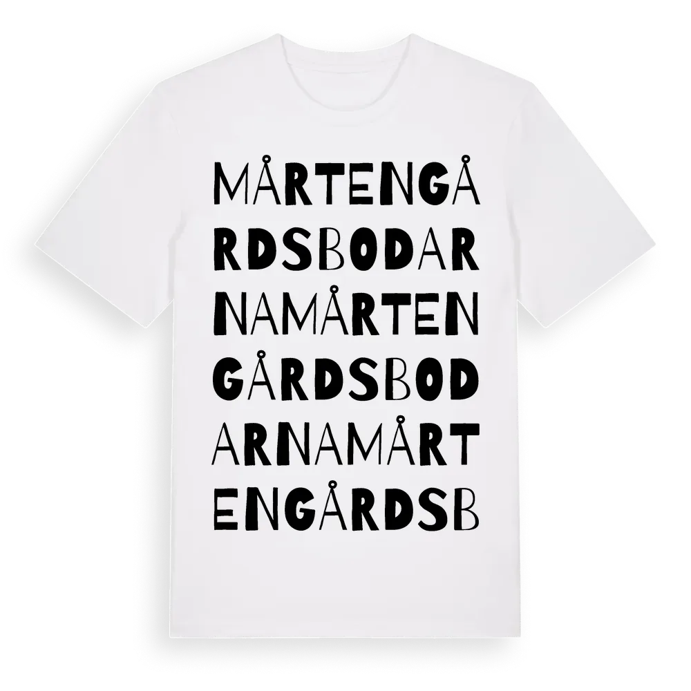 Mårtengårdsbodarna ordlek t-shirt är inspirerad av Mårtengårdsbodarna i Jämtlands län, Sverige. Tröjan är designad för dig som har en speciell koppling till platsen – oavsett om du bor här, har rötterna här eller bara älskar Mårtengårdsbodarna.