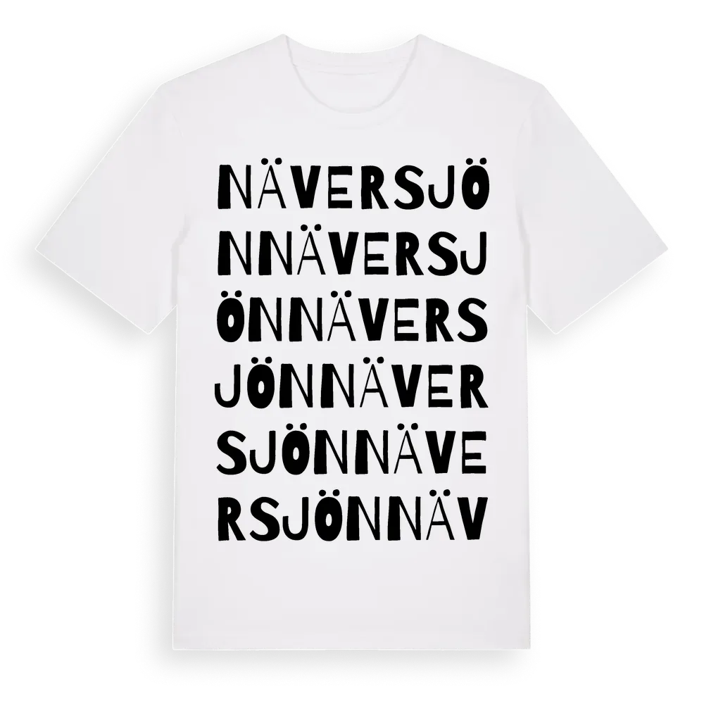 Näversjön ordlek t-shirt är inspirerad av byn Näversjön i Jämtlands län, Sverige. Tröjan är designad för dig som har en speciell koppling till platsen – oavsett om du bor här, har rötterna här eller bara älskar Näversjön.