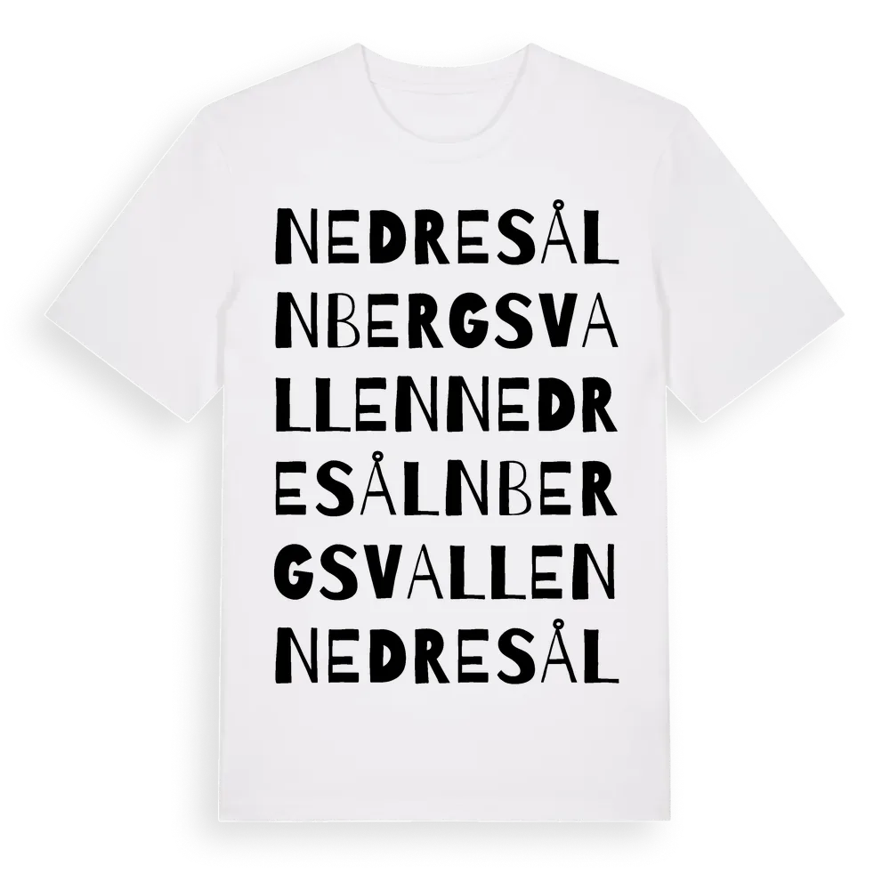 Nedre Sålnbergsvallen ordlek t-shirt är inspirerad av Nedre Sålnbergsvallen i Jämtlands län, Sverige. Tröjan är designad för dig som har en speciell koppling till platsen – oavsett om du bor här, har rötterna här eller bara älskar Nedre Sålnbergsvallen.