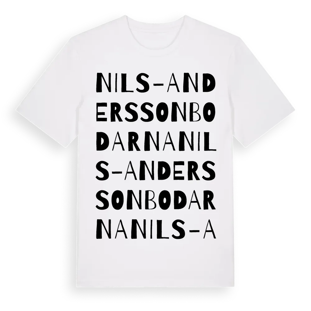 Nils-Anderssonbodarna ordlek t-shirt är inspirerad av Nils-Anderssonbodarna i Jämtlands län, Sverige. Tröjan är designad för dig som har en speciell koppling till platsen – oavsett om du bor här, har rötterna här eller bara älskar Nils-Anderssonbodarna.