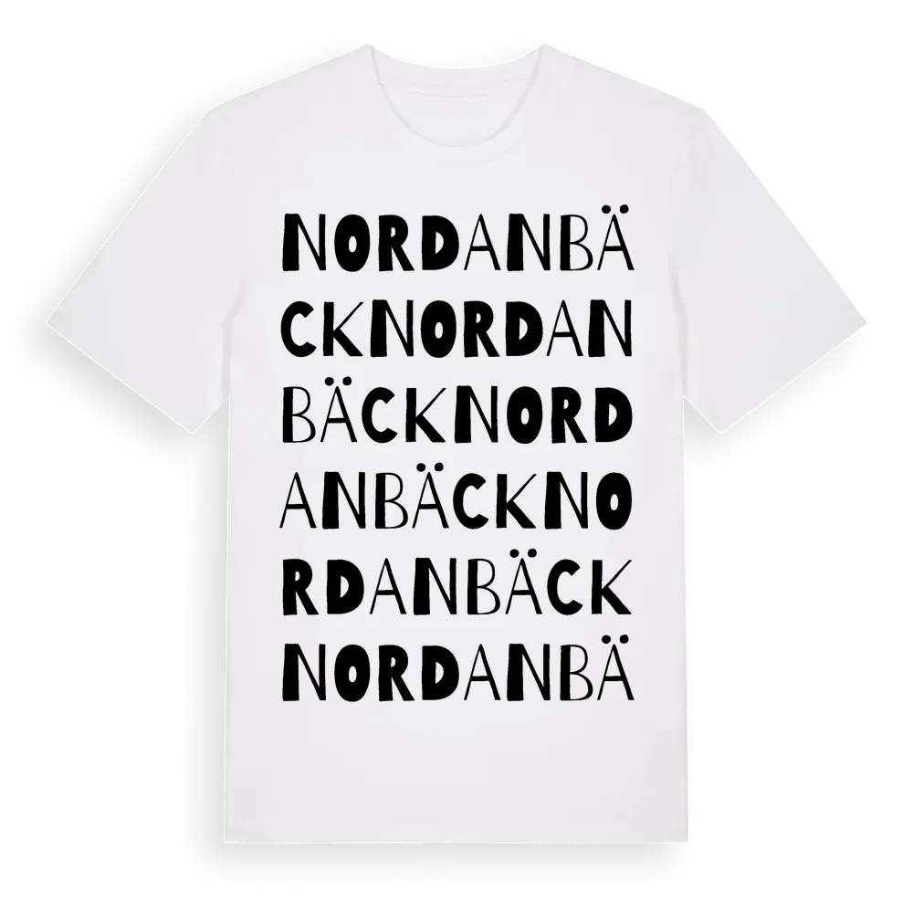Nordanbäck ordlek t-shirt är inspirerad av Nordanbäck i Jämtlands län, Sverige. Tröjan är designad för dig som har en speciell koppling till platsen – oavsett om du bor här, har rötterna här eller bara älskar Nordanbäck.