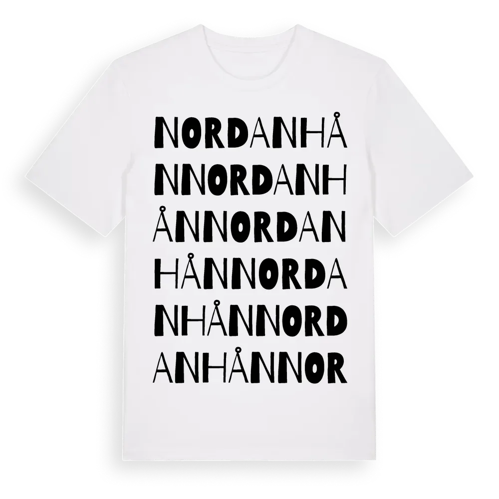 Nordanhån ordlek t-shirt är inspirerad av byn Nordanhån i Jämtlands län, Sverige. Tröjan är designad för dig som har en speciell koppling till platsen – oavsett om du bor här, har rötterna här eller bara älskar Nordanhån.