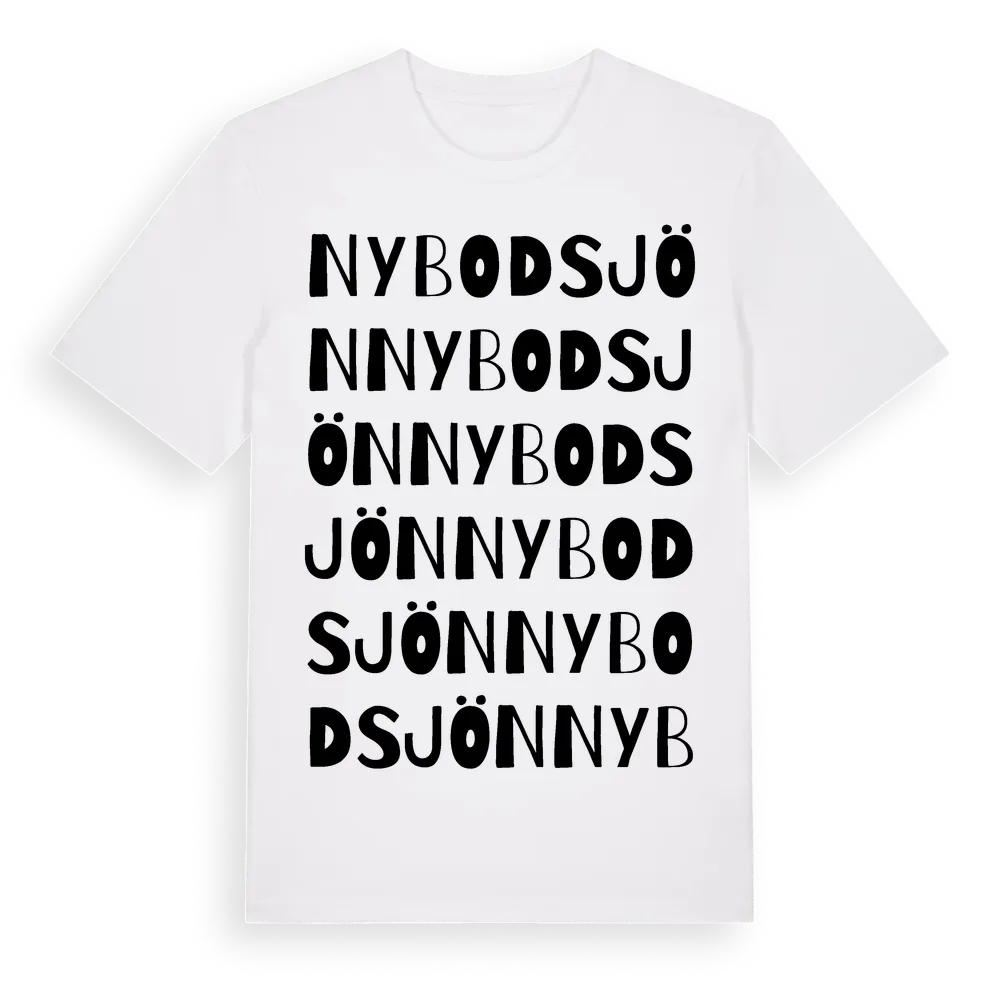 Nybodsjön ordlek t-shirt är inspirerad av Nybodsjön i Jämtlands län, Sverige. Tröjan är designad för dig som har en speciell koppling till platsen – oavsett om du bor här, har rötterna här eller bara älskar Nybodsjön.