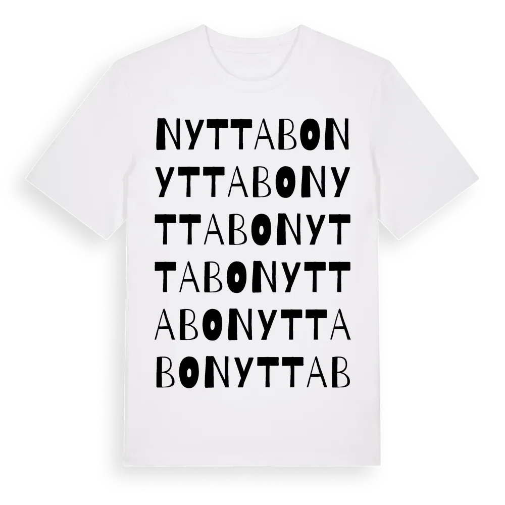 Nyttabo ordlek t-shirt är inspirerad av Nyttabo i Jämtlands län, Sverige. Tröjan är designad för dig som har en speciell koppling till platsen – oavsett om du bor här, har rötterna här eller bara älskar Nyttabo.