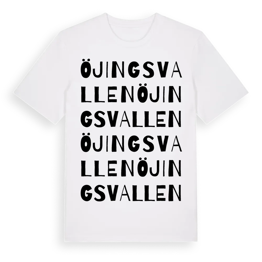Öjingsvallen ordlek t-shirt är inspirerad av Öjingsvallen i Jämtlands län, Sverige. Tröjan är designad för dig som har en speciell koppling till platsen – oavsett om du bor här, har rötterna här eller bara älskar Öjingsvallen.