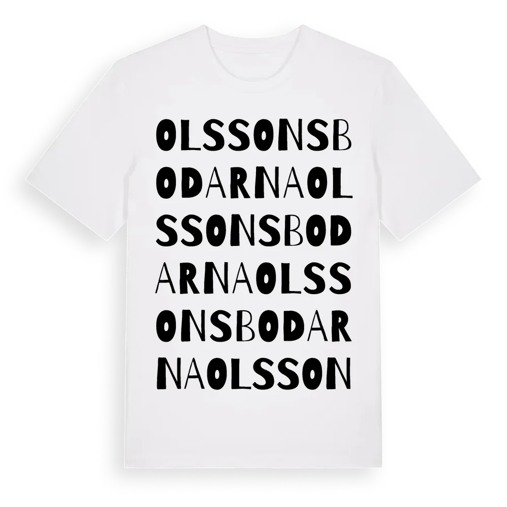 Olssonsbodarna ordlek t-shirt är inspirerad av Olssonsbodarna i Jämtlands län, Sverige. Tröjan är designad för dig som har en speciell koppling till platsen – oavsett om du bor här, har rötterna här eller bara älskar Olssonsbodarna.