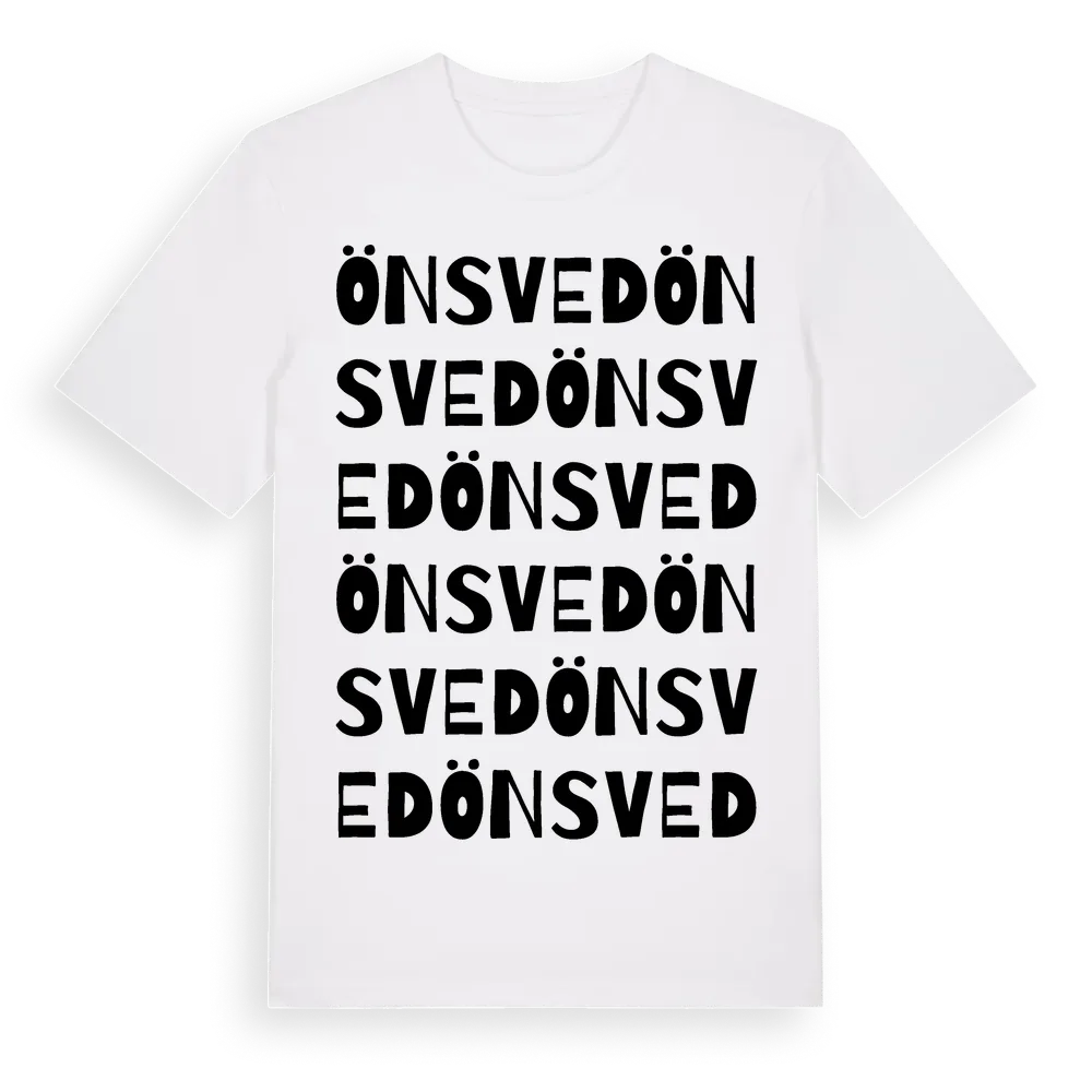 Önsved ordlek t-shirt är inspirerad av byn Önsved i Jämtlands län, Sverige. Tröjan är designad för dig som har en speciell koppling till platsen – oavsett om du bor här, har rötterna här eller bara älskar Önsved.