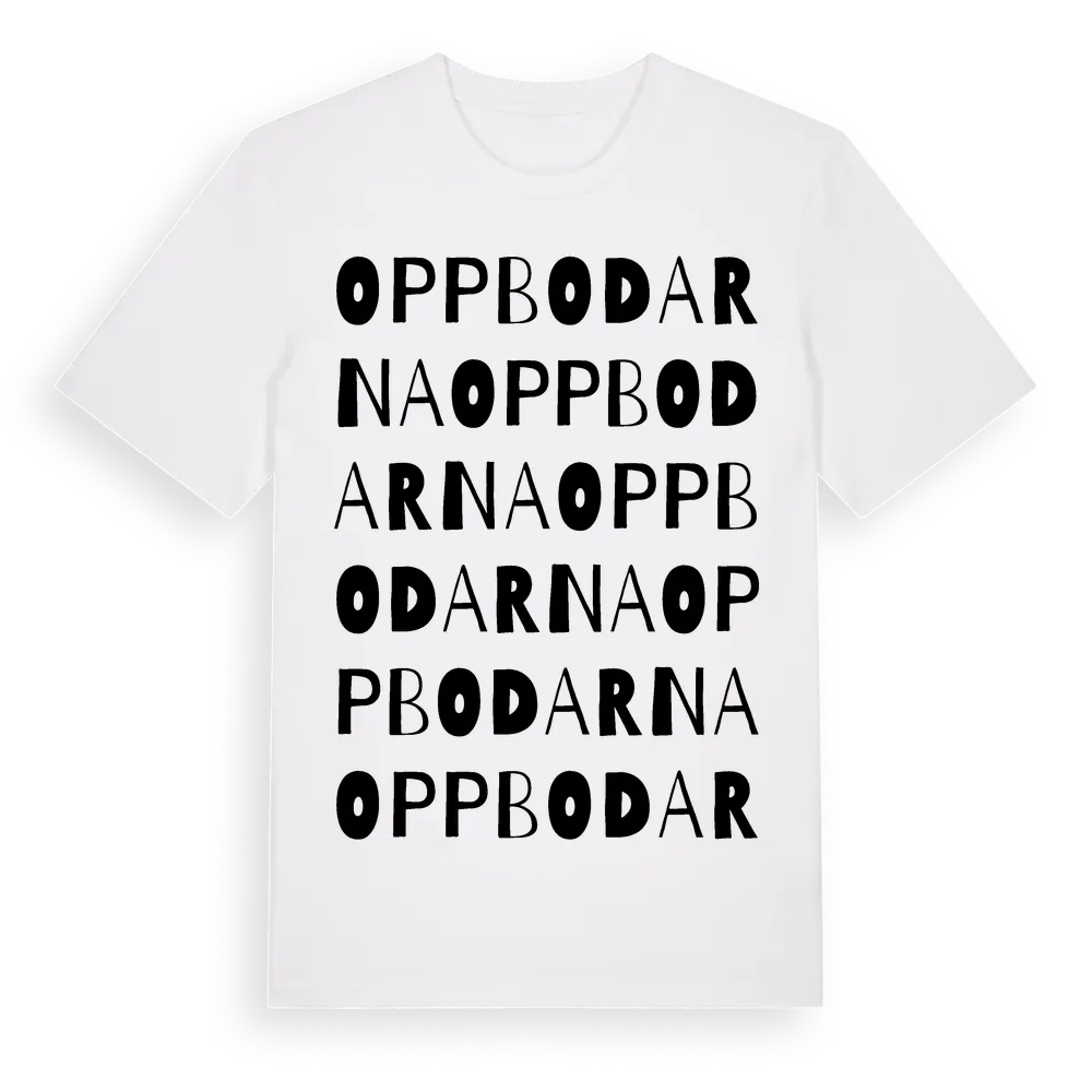Oppbodarna ordlek t-shirt är inspirerad av Oppbodarna i Jämtlands län, Sverige. Tröjan är designad för dig som har en speciell koppling till platsen – oavsett om du bor här, har rötterna här eller bara älskar Oppbodarna.