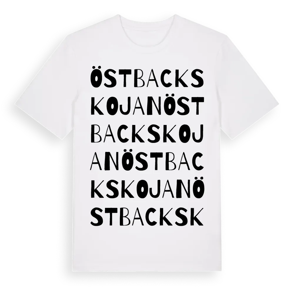 Östbackskojan ordlek t-shirt är inspirerad av Östbackskojan i Jämtlands län, Sverige. Tröjan är designad för dig som har en speciell koppling till platsen – oavsett om du bor här, har rötterna här eller bara älskar Östbackskojan.